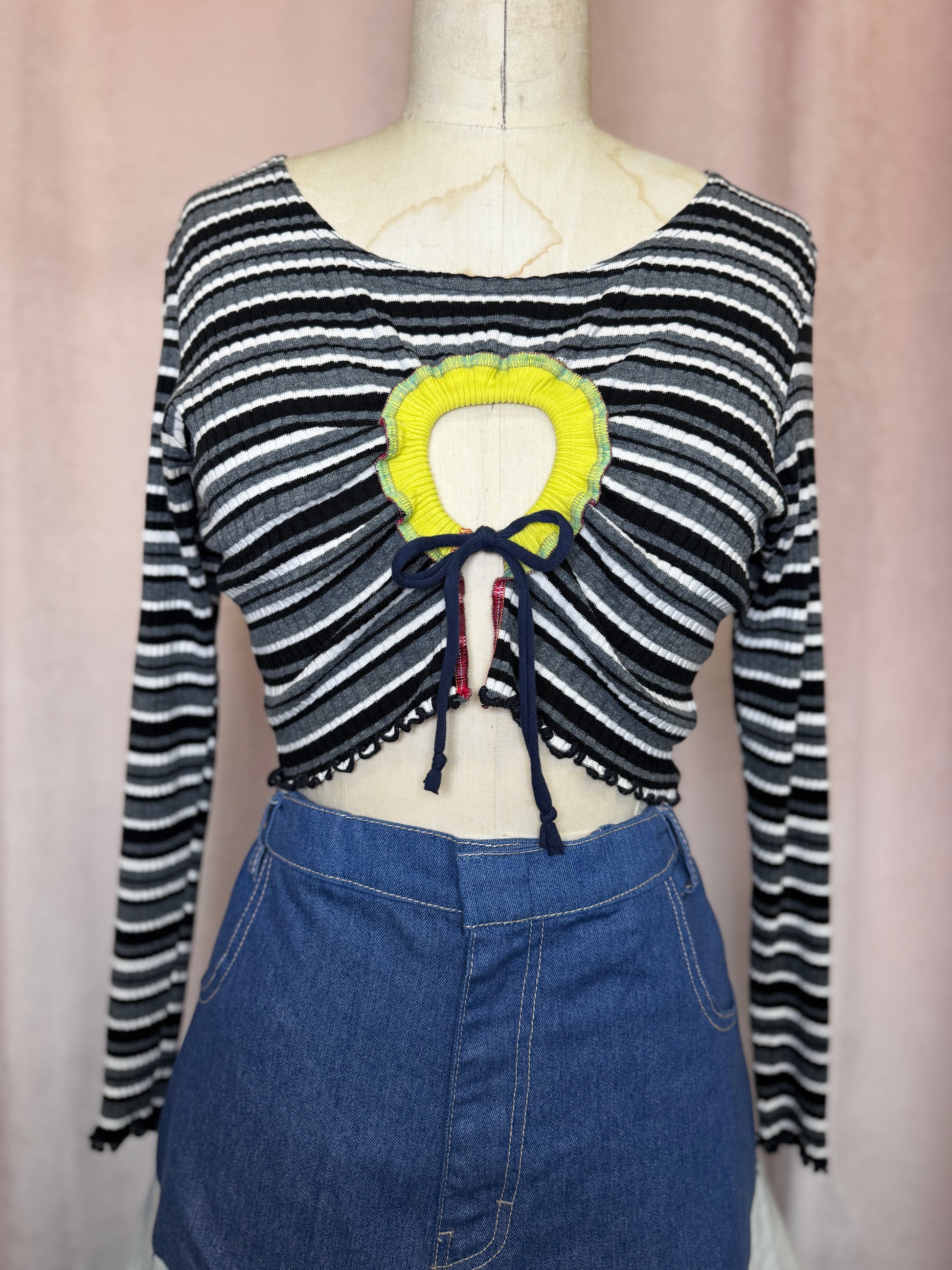 Inspired by clown culture, gift wrapping, finding hidden joys—& ofc, tasteful sideboob—this whimsical collection of “Peek-a-Bow” tops will keep you covered while keeping it cute!